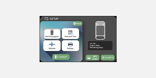 | Feature | Ergonomics design (45˚ display layout) Door Inter-lock Semiautomatic Chamber Door LED Indicator (for cycle progress) Semiautomatic Sterilizing Agent Supply System |